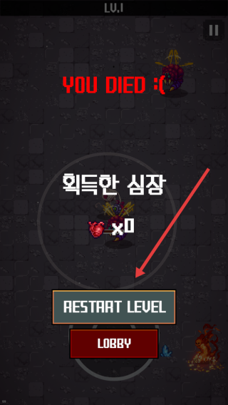 3、若角色死亡显示YOU DIED,点击RESTART LEVEL按钮,重启当前关卡,调整策略再战地牢。