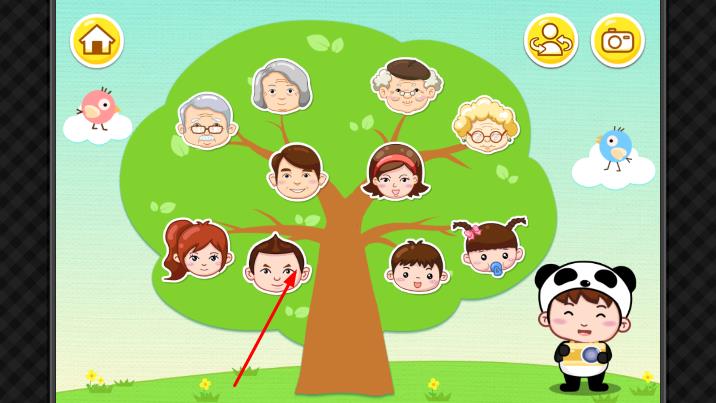 2、点击头像后,进入对应家庭成员的互动场景,场景中会显示该成员的名称,通过互动元素触发动画,帮助认识该家庭成员。