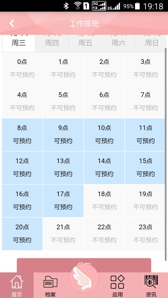 2、工作排班,设置自己的可提供服务的工作时间表,可提前两周进行排班