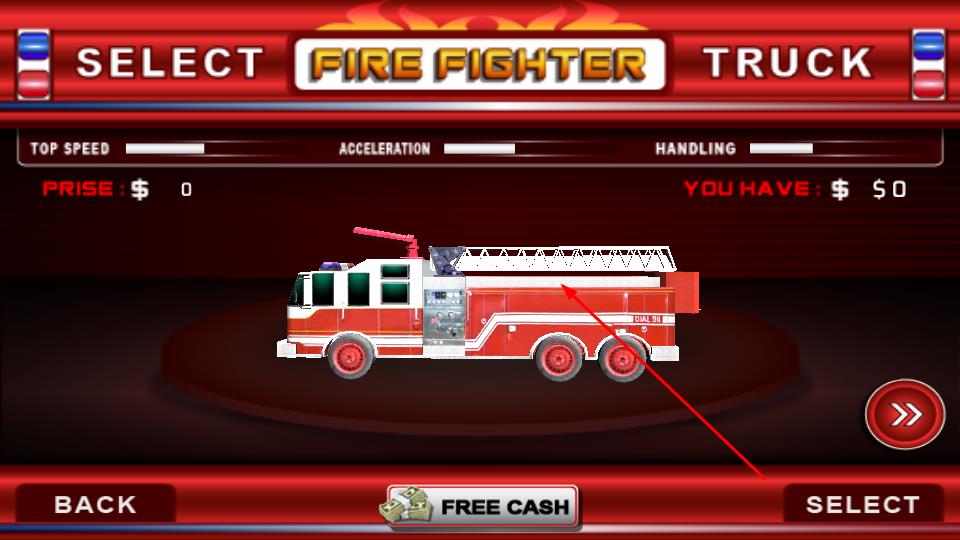 1、点击SELECT按钮选定消防车,查看其速度、加速与操控属性,开启城市救援任务流程。