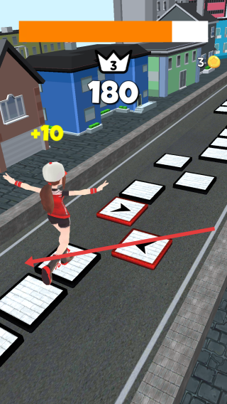 3、沿白色方块路径跳跃,注意上方皇冠及数字的进度,遇到+10及时的拾取,稳定节奏,完成关卡挑战。