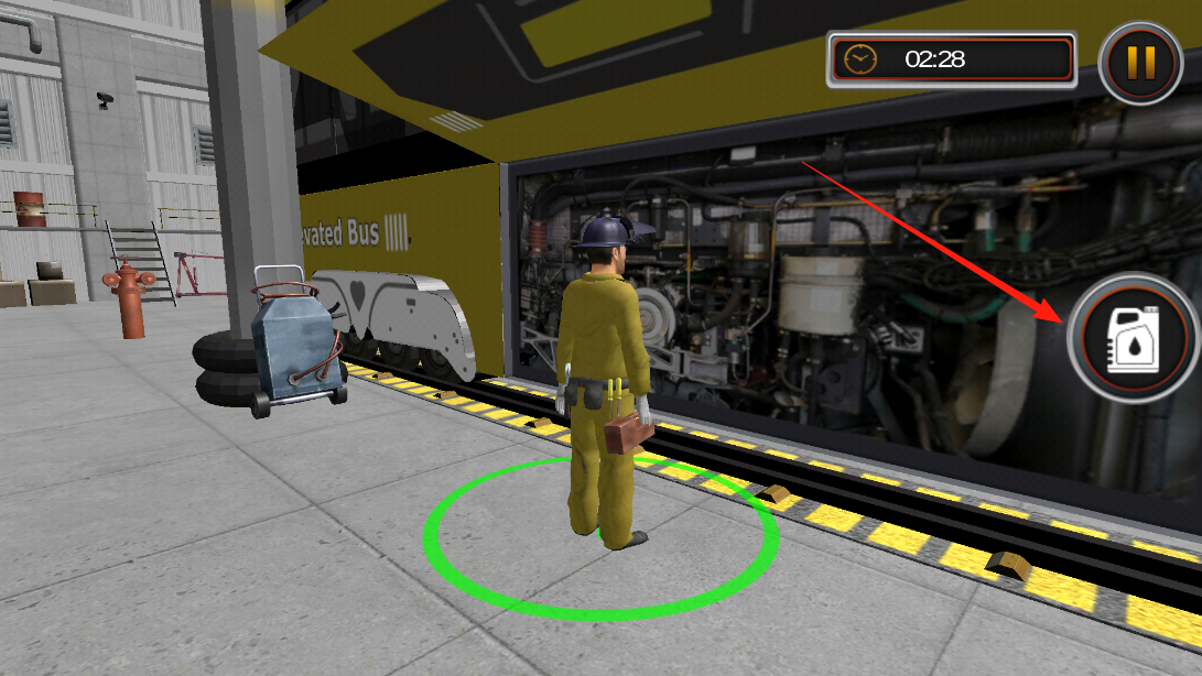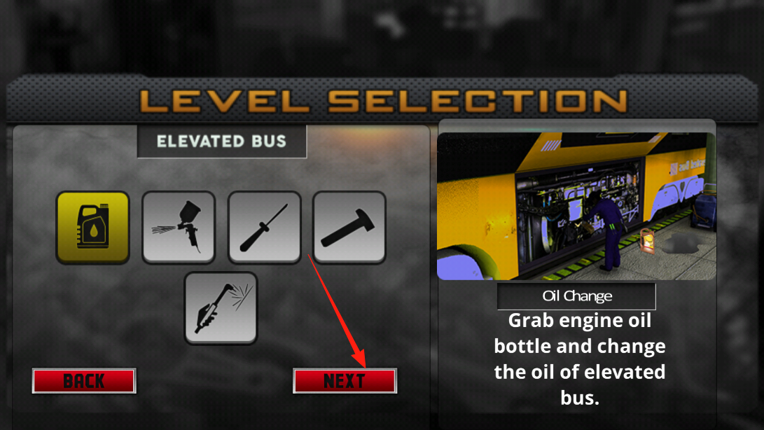 1、点击NEXT进入高架巴士维修关卡,依据工具图标提示,选定对应维修任务开启换油等专项挑战,体验车辆维护的分步机制。