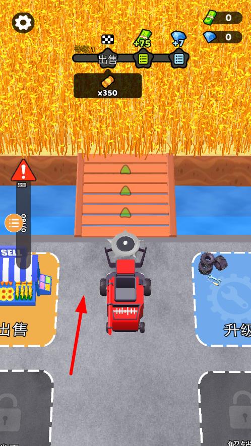 1、进入游戏后,选择初始关卡,通过虚拟摇杆控制收割机移动,点击割草按钮启动割草功能,熟悉基础操作以完成首块草坪清理。