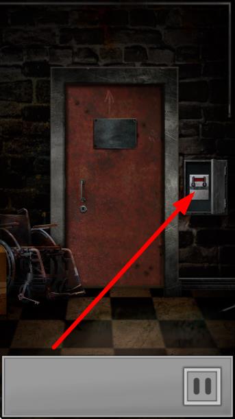 3、我们来到门旁场景,按照红色箭头指向,点击门右侧的配电箱,尝试破解机关开门。