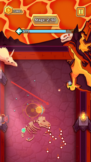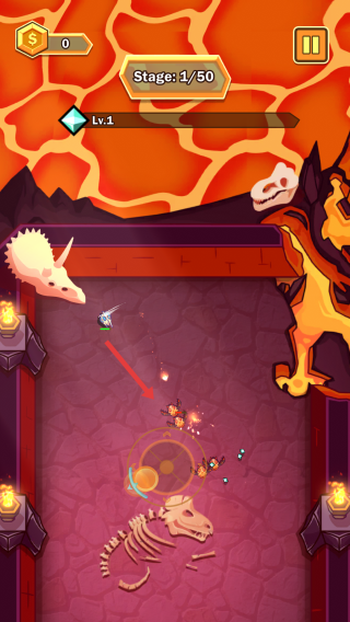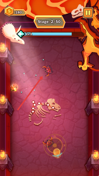 1、开局在第一关,移动角色瞄准对面的小怪物,利用射击的准星来锁定,快速点击射击键消灭。