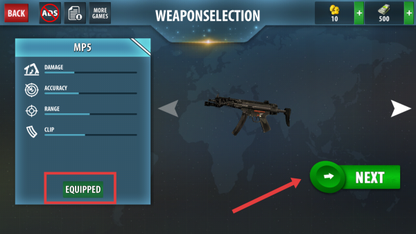 3、在确认MP5武器已装备EQUIPPED,通过箭头指向处点击右侧绿色NEXT按钮,开启任务挑战。