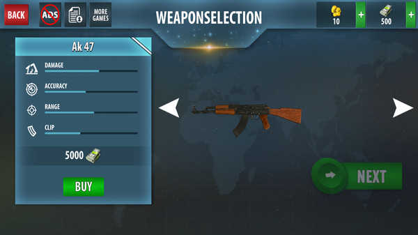 2、在关卡选择界面选定好第一关后,按照指示点击右侧绿色NEXT按钮,进入武器选择界面。