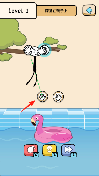 3、持续点击对应手掌,精准控制火柴人,使其降落在粉色火烈鸟游泳圈目标鸭子上,完成关卡1任务。