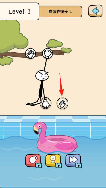 1、关卡1降落在鸭子上,点击红箭头指向的手掌图标,让火柴人下落抓取,调整位置。