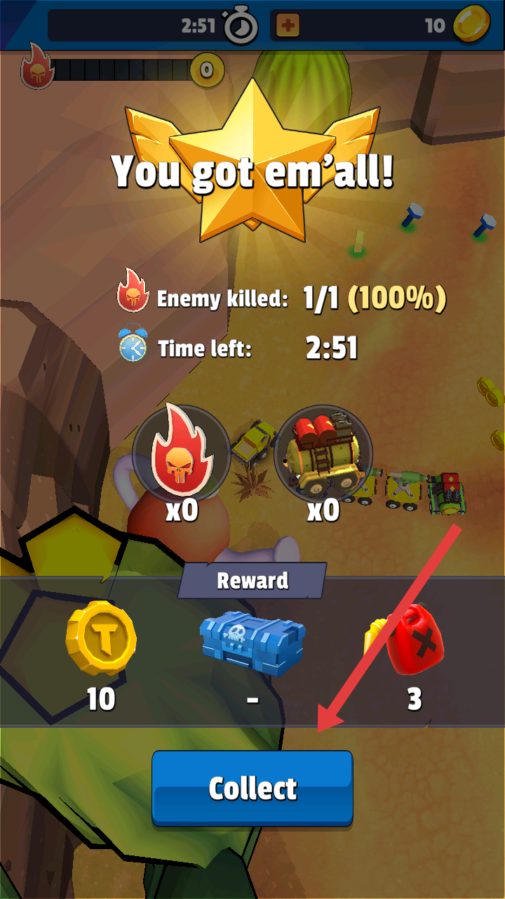3、关卡胜利后,点击下方蓝色Collect按钮,领取金币、机油等奖励,用于解锁新战车或强化战车的技能。