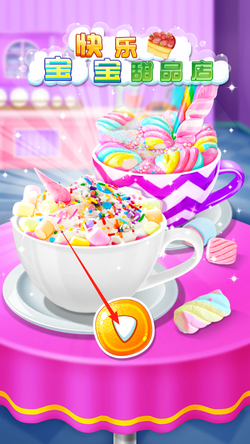 1、进入快乐宝宝甜品店界面,点击带有箭头指示的橙色按钮开启甜品制作流程,通过该按钮进入下一环节,可解锁各类甜品制作场景。