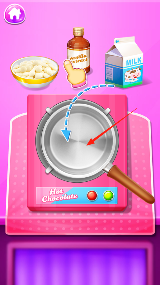 2、在制作热巧克力步骤依据指引拖动香草精,按蓝色箭头方向放入锅中,接着准备添加其他原料按流程推进热巧克力制作。