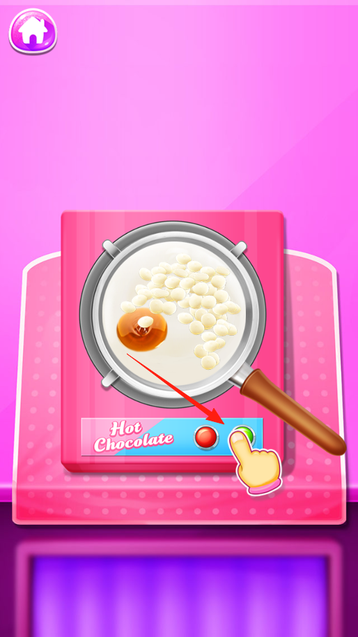 3、热巧克力原料放入后根据提示点击绿色按钮启动加热程序,通过操作按钮让原料在锅中加热,逐步完成热巧克力制作。
