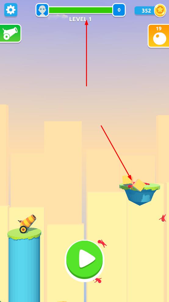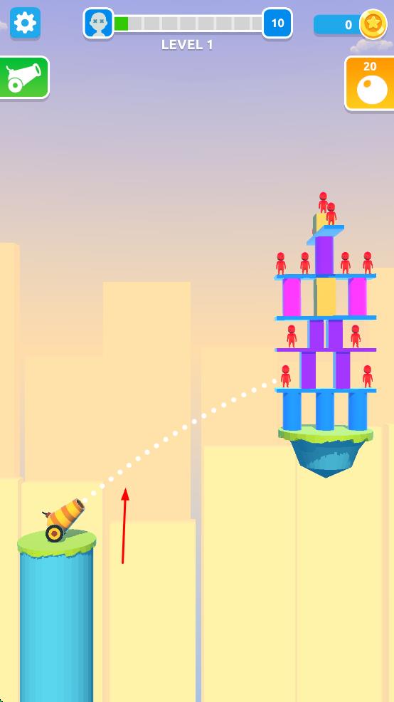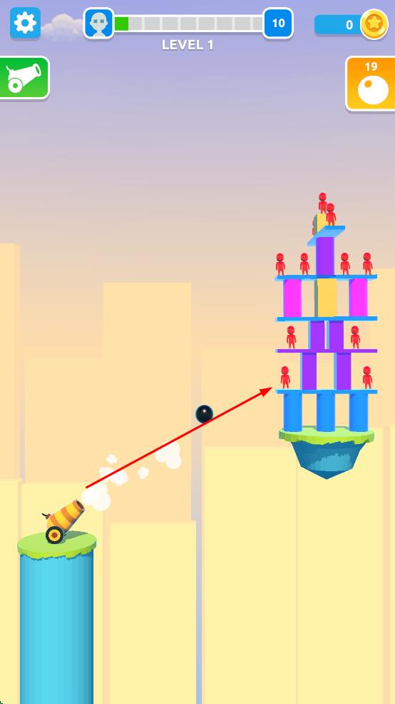 1、场景为简约城市背景,左侧平台的大炮为操作核心,右侧浮空平台上有彩色板块搭建的结构,结构上分布红色小人,需通过大炮发射黑色球体摧毁目标。
