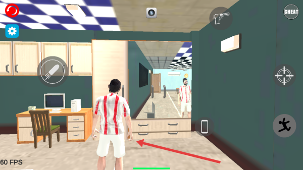1、初始在房间场景,留意左上角重置、设置等界面功能,沿箭头方向朝门外行进,可活用近战刀或枪械,开启探索流程。