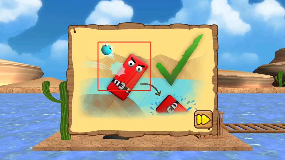 1、开局跟随教程指引,操控蓝色小球瞄准红色框选的红色方块发射,借撞击力将其推入水中,完成初始目标。