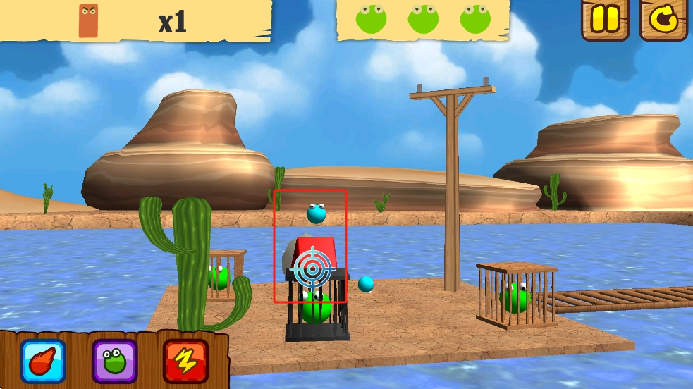 2、瞄准红色框选的红色方块,发射蓝色小球击碎障碍,解救笼中绿球,同时观察场景内其他笼子位置,规划击球顺序。