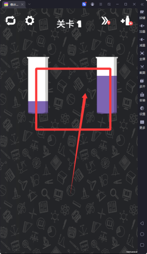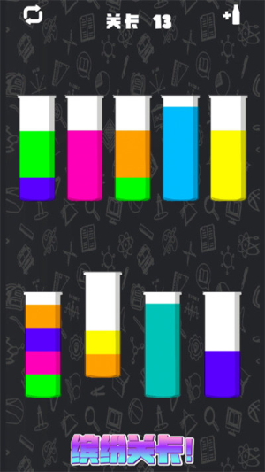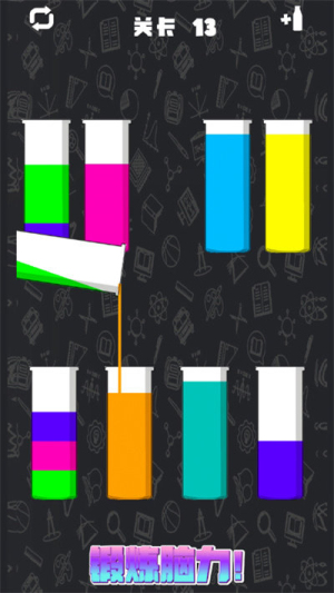 1、玩家需要通过点击和滑动屏幕来控制试管中的液体流动,将不同颜色的液体混合成统一颜色以完成关卡目标。
