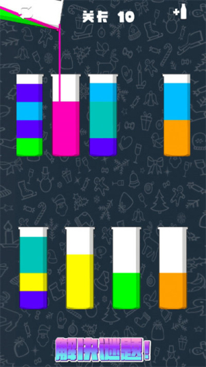 2、游戏玩法创新有趣,玩家通过倒水操作将不同颜色的液体混合成统一颜色,操作简单但策略性强,充满挑战乐趣。