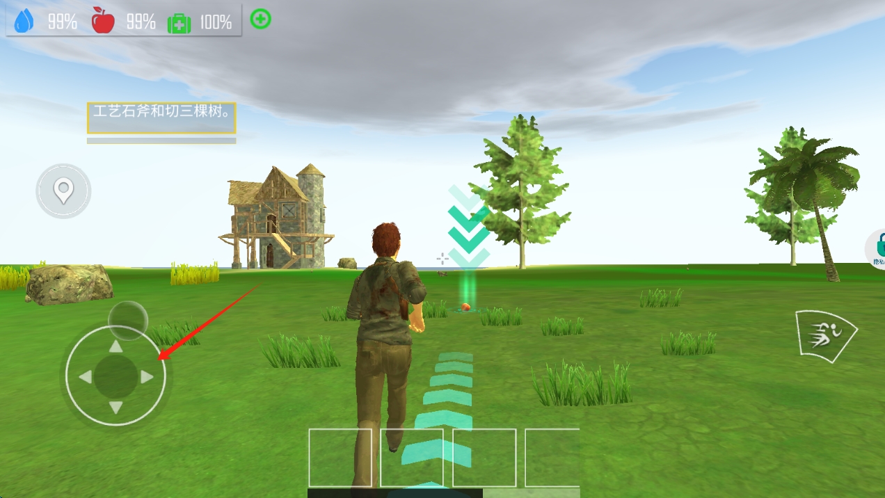 2、游戏中,熟练使用左侧虚拟摇杆,控制角色在荒岛环境中移动,探索资源和安全区域。