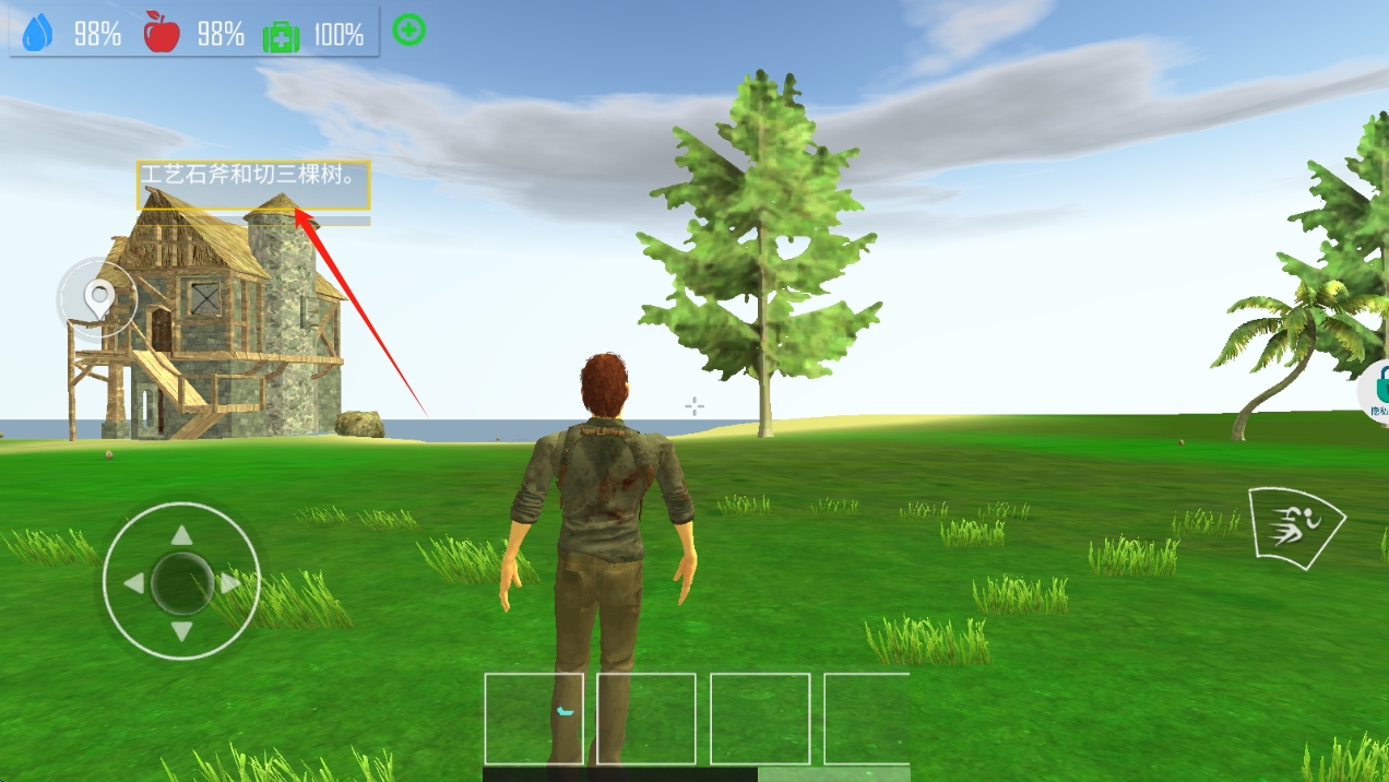 3、根据任务提示,先制作石斧,再砍伐三棵树,获取木材资源,为后续生存和建造做准备。