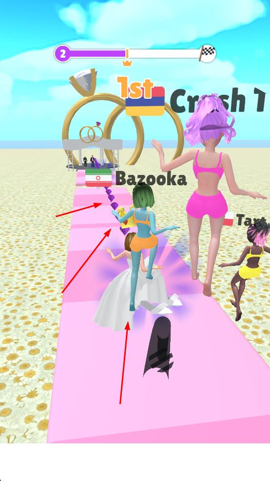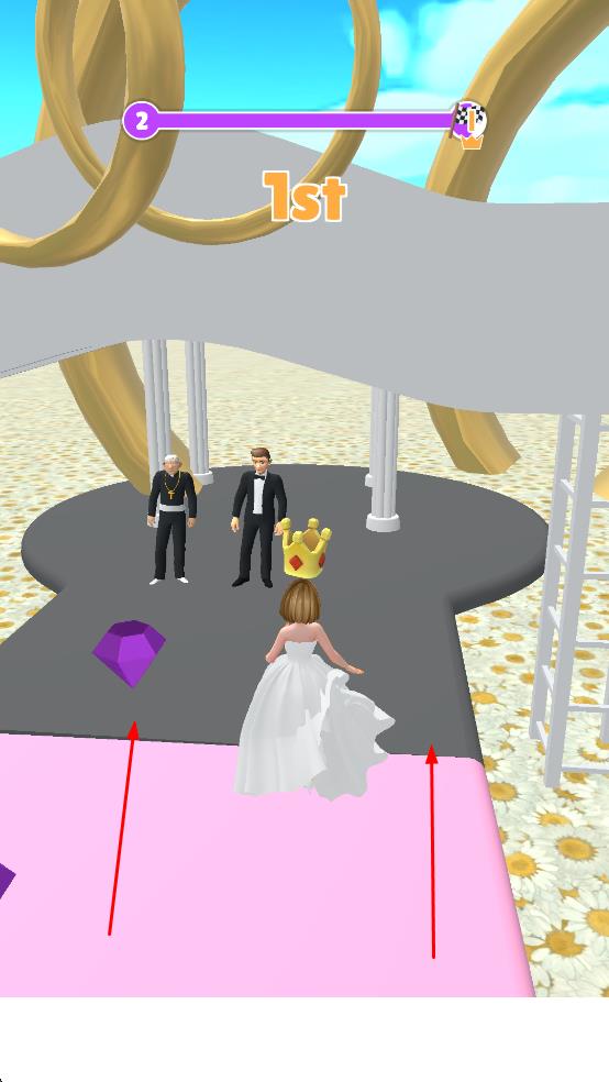 1、操控角色在粉色婚礼跑道上开启竞速,与其他选手竞争,初始排名随进程变化。