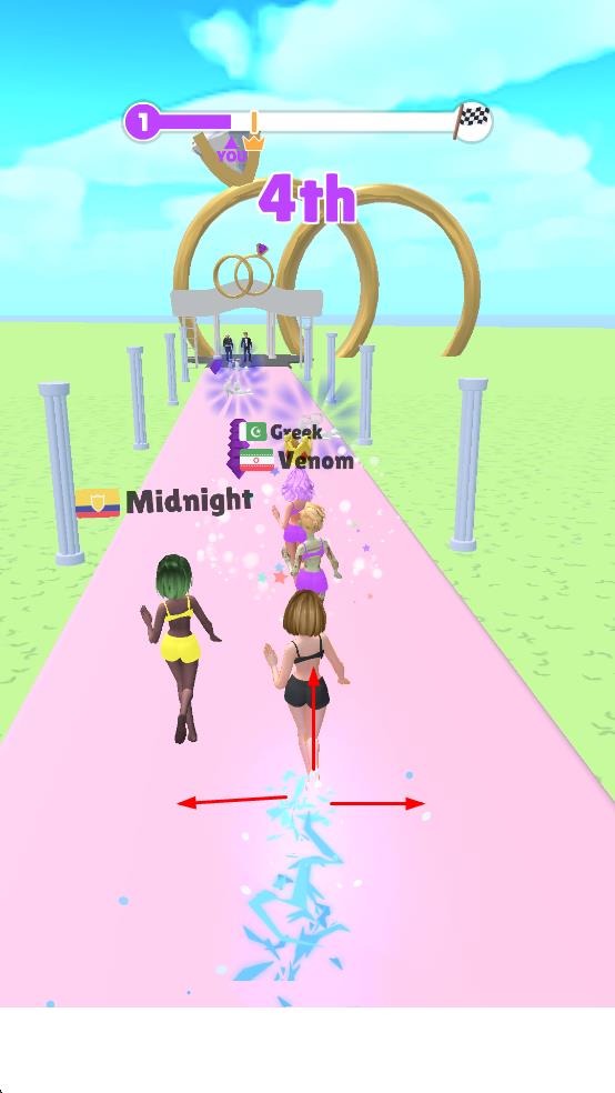 2、收集物品解锁体验:奔跑中收集赛道上的婚纱与装饰物,不仅能让新娘以靓丽姿态闯关,还能解锁更多梦幻对决场景,让收集过程成为乐趣,丰富闯关目标与体验。