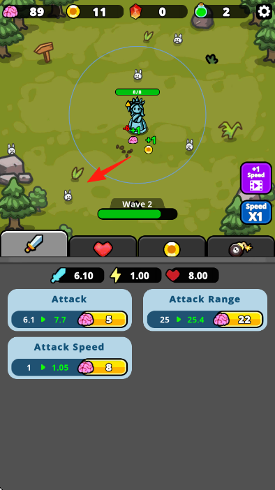 2、敌人兔子、僵尸沿红箭头方向靠近,角色自动攻击,注意Wave进度条,消灭一波敌人后,金币、大脑变化,可继续升级。