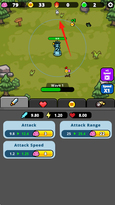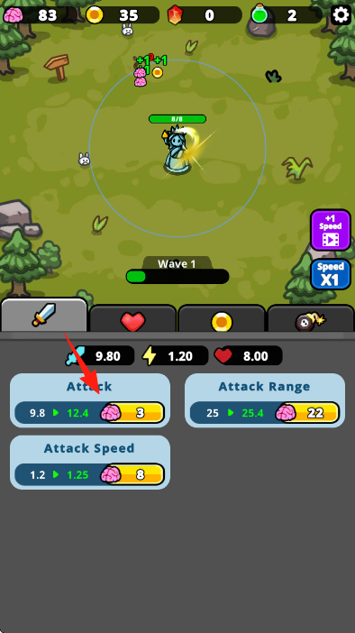 3、战斗中,利用升级后的攻击9.8→12.4、攻速,快速清理红箭头指向的敌人,保护自身血量,完成Wave波次,获取奖励。