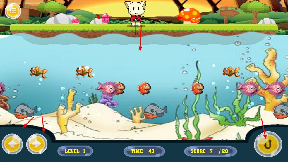 1、操控猫咪角色在岸边准备,通过左右箭头按钮调整位置,点击鱼钩按钮下钩。