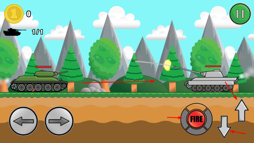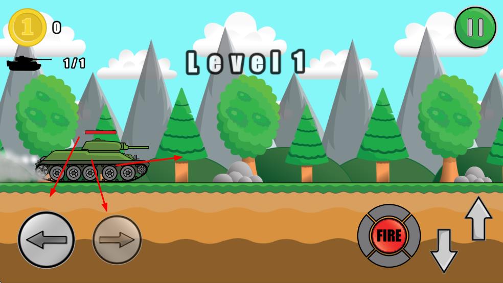 1、处于Level1关卡,操控绿色坦克,通过左下角左右箭头按钮调整位置,开启战斗进程。