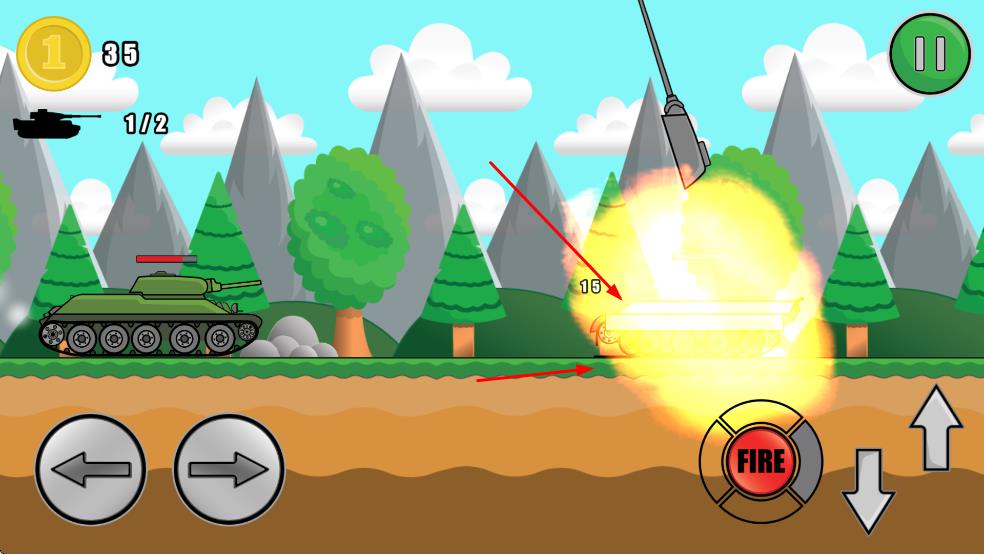 2、点击右下角红色FIRE按钮发射炮弹,攻击敌方灰色坦克,留意敌方血量变化与自身金币积累。