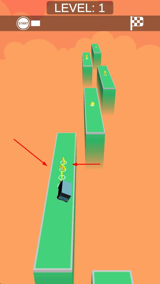 2、在跑酷过程中,操控车辆在绿色平台间移动,收集黄色金币,避开掉落风险,持续推进积累分数。