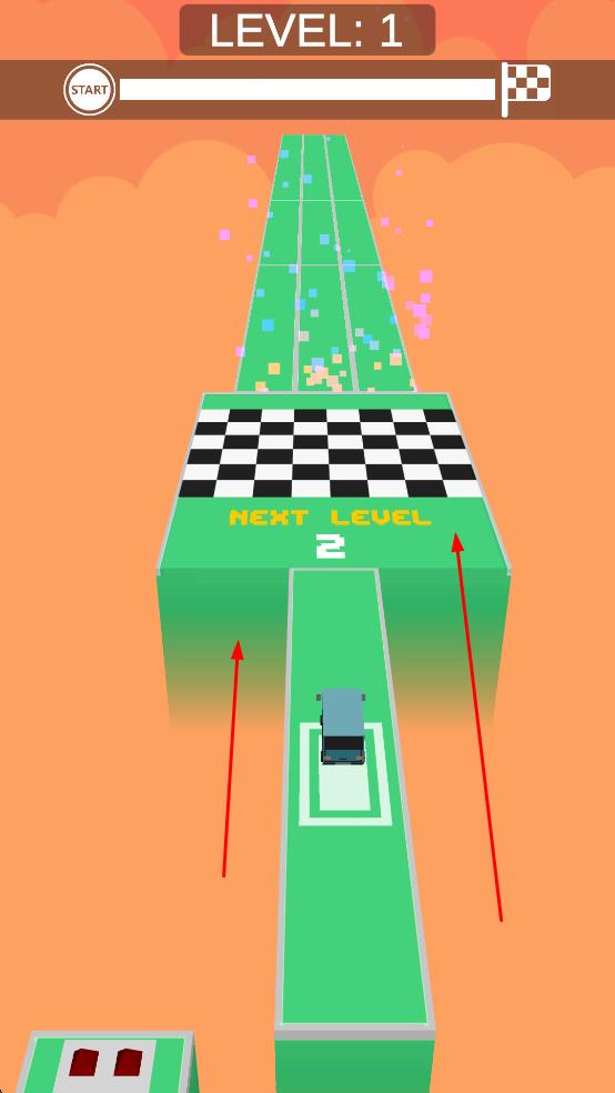 3、抵达黑白格终点区域后,触发NEXTLEVEL2提示,完成LEVEL1关卡挑战,进入下一关继续跑酷冒险。
