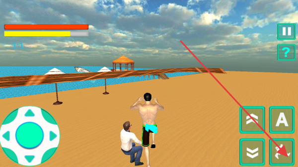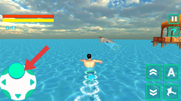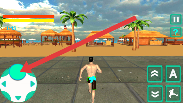 1、点击左边的虚拟摇杆向前移动,用左侧虚拟摇杆控制角色方向,在沙滩、海水区域自由探索。