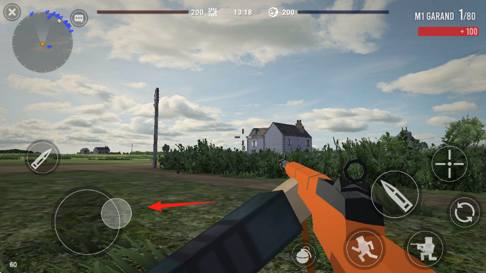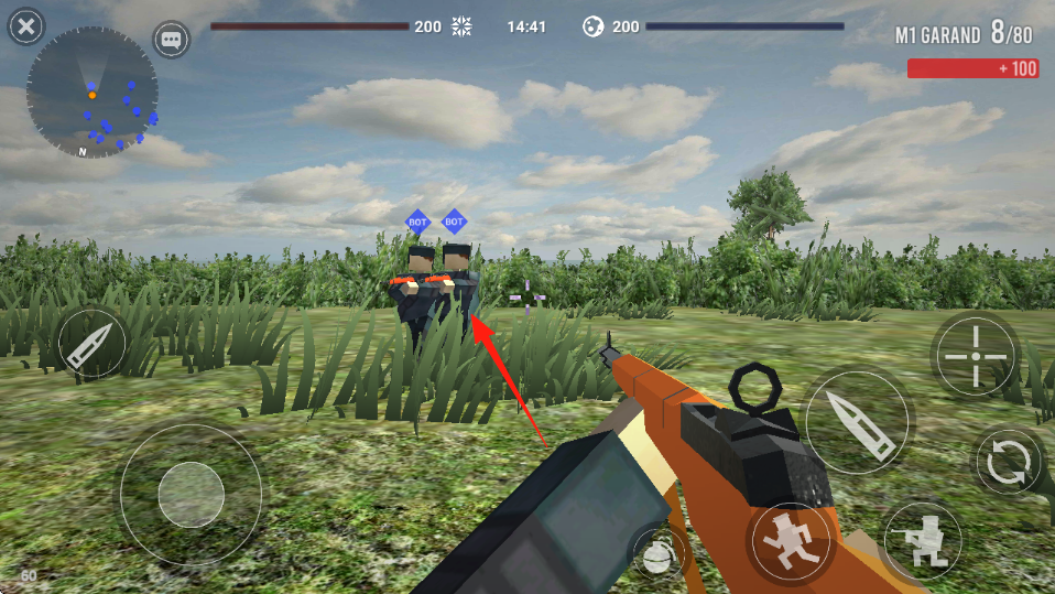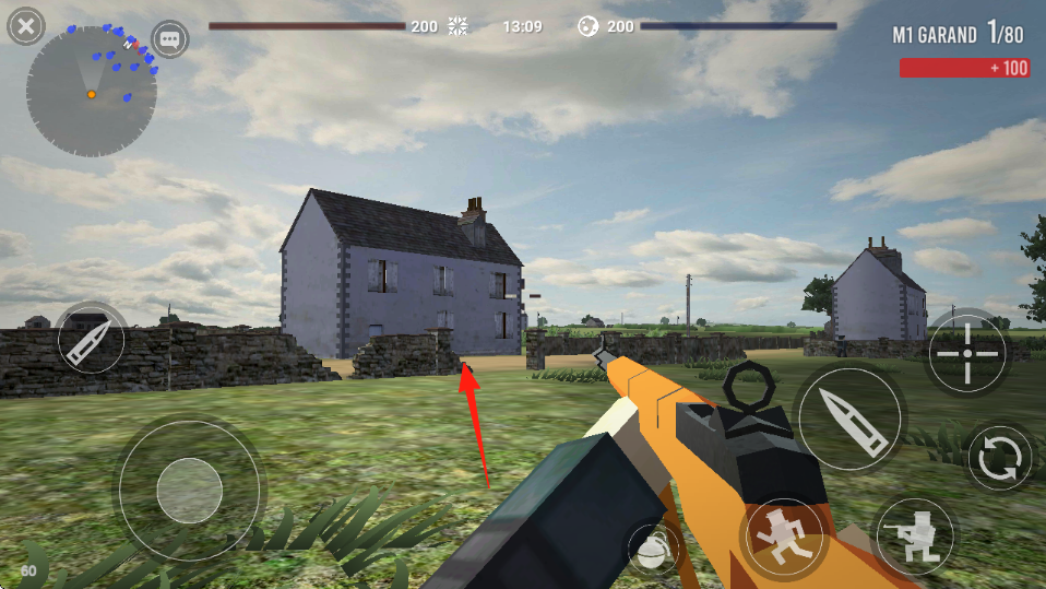1、进入战场,手持M1GARAND步枪,红箭头指向敌方AIBOT,利用虚拟摇杆移动,点击射击键,瞄准消灭敌人,注意弹药。