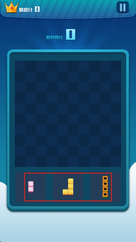 1、初始界面中,选择底部粉色、黄色、橙色方块,拖动至棋盘内,构建消除布局,开启游戏进程。