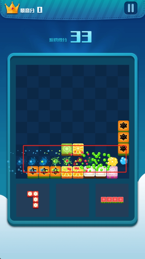 2、当方块连成一整行时就会进行消除,我们需要利用好每一个空隙,合理使用方块,持续消除积累得分。