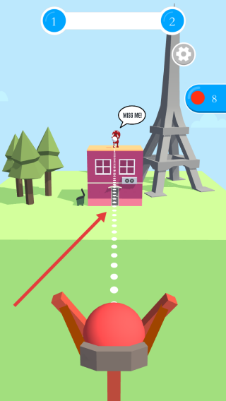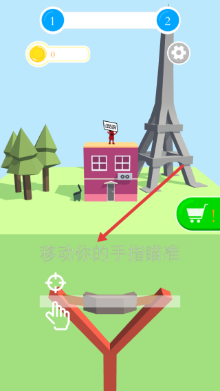 1、进入游戏,拖动手指调整弹弓瞄准角度,对准屋顶举牌目标,松开手指发射弹丸,尝试精准命中。