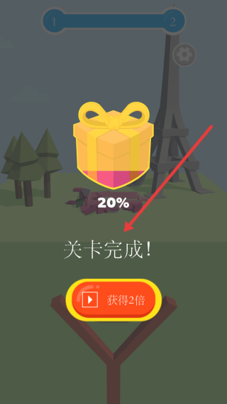 3、成功命中目标后,等待结算,出现关卡完成提示,可选择获得2倍翻倍奖励,继续挑战后续关卡。