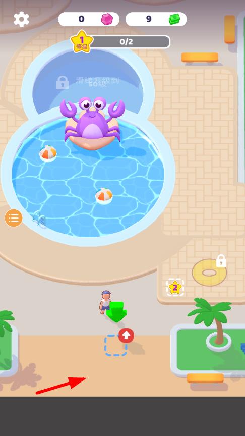 1、进入游戏后,从一片空白场地开始规划,熟悉乐园建设的基础操作,先搭建基础的滑水道和游泳池,吸引首批游客入园体验。