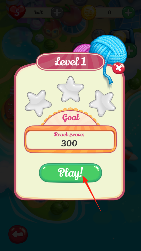 1、进入游戏第一关界面,看到目标是得分达到300,点击Play!按钮,就能开始玩消除糖果的游戏,通过消除糖果积累分数,争取达成目标。