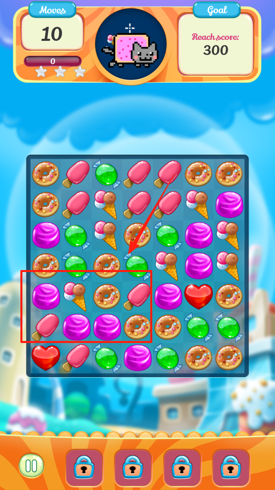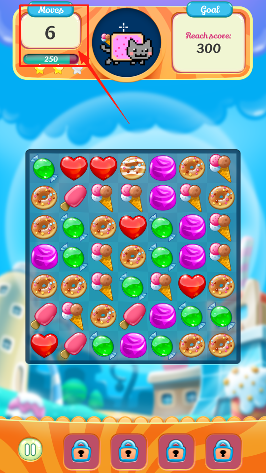 3、上方Moves显示剩余步数,要在步数用完前达到300分目标,每消除一次糖果会消耗一步,所以得规划好消除策略,尽量在有限步数里多消除多得分,完成关卡挑战。