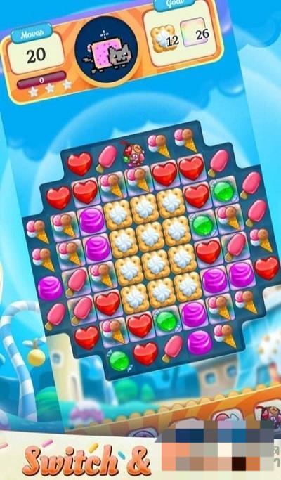 2、屏幕是各种糖果的棋盘,要找相邻的相同糖果,用手指滑动交换它们位置,让三个及以上相同糖果连成一线消除,每消除一组糖果能得分,还能触发连锁反应多得分。