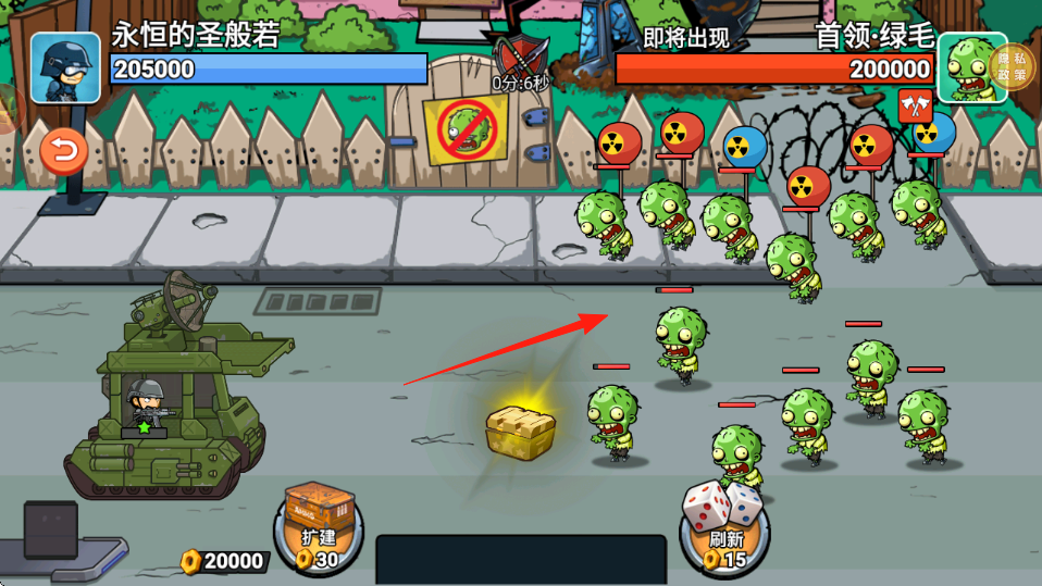 1、关卡开始,红箭头指向僵尸群,点击扩建强化坦克,或刷新调整僵尸波次,利用坦克自动攻击,消耗僵尸血量。