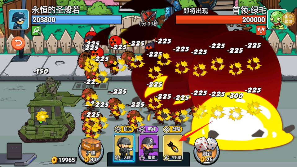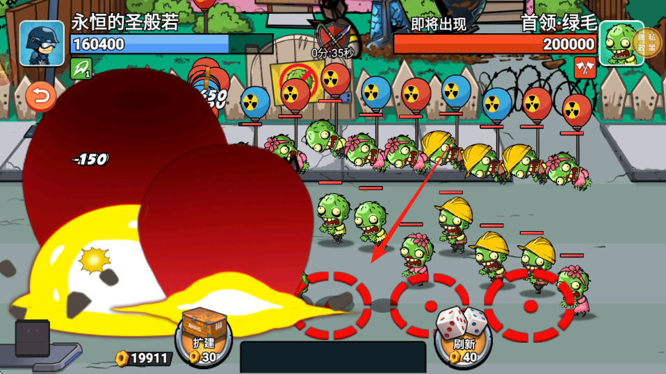 3、持续攻击,红箭头标记新僵尸戴花、安全帽,释放技能爆炸范围-150,清理威胁,保护基地血量,完成波次,获取金币。