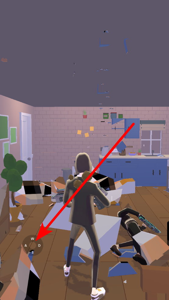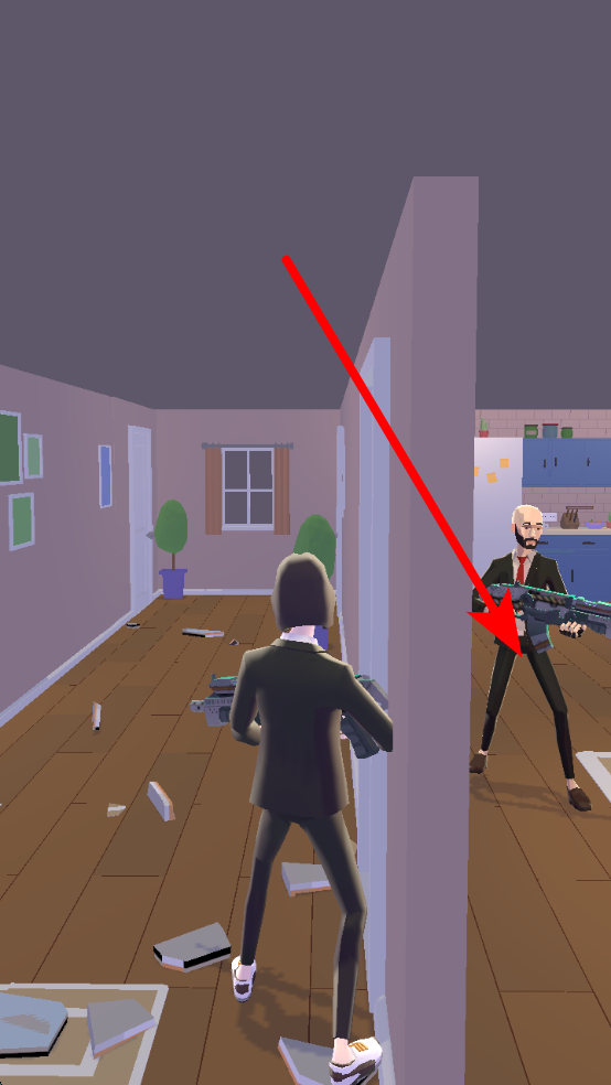 3、观察瞄准攻击敌人,进入房间后,迅速发现西装敌人,角色会自动进行射击,你只需巧妙控制移动,利用物体躲避子弹,消灭敌人。