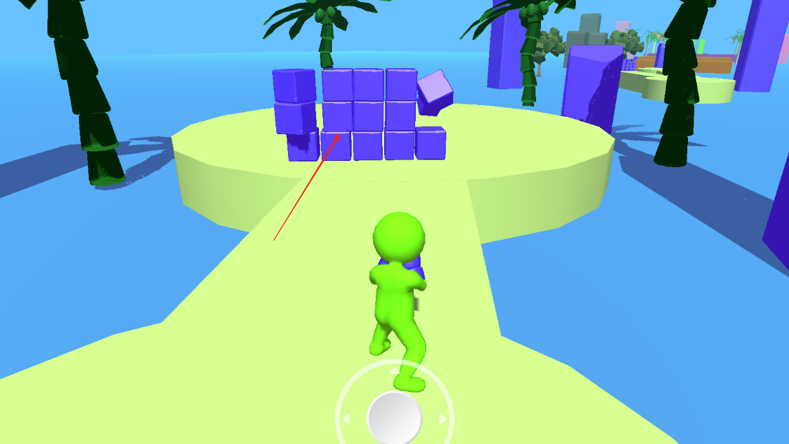 1、点击开始按钮进入对战场景,熟悉虚拟摇杆的移动操作和攻击按钮的使用方法,点击屏幕让小人伸长手臂将障碍击飞。