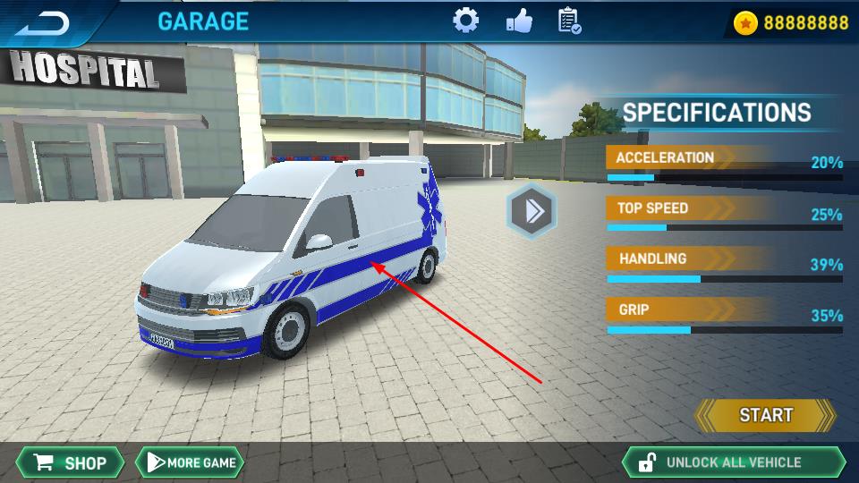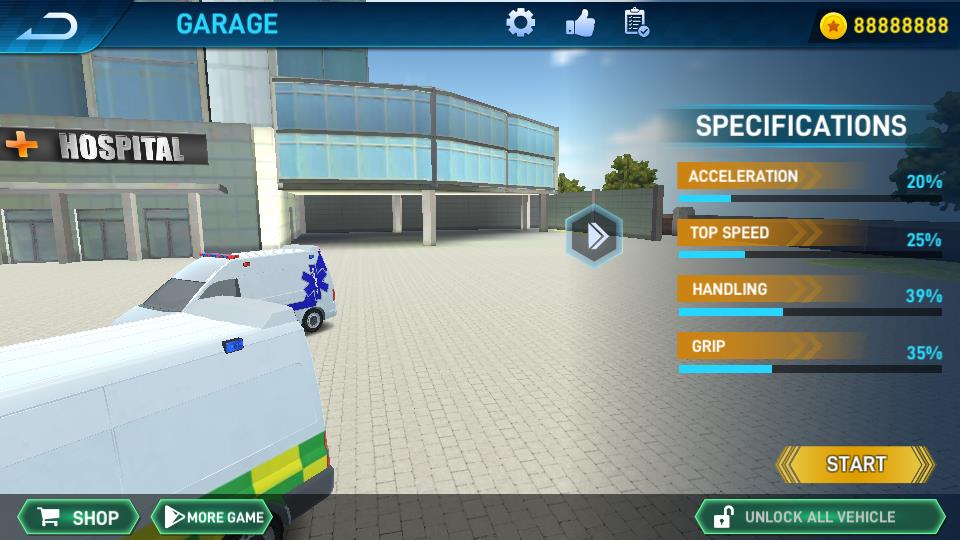 1、进入GARAGE界面查看救护车的加速度、极速、操控性、抓地力等属性,点击右下角START按钮,开启任务挑战。