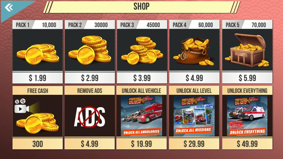 3、进入SHOP界面,可购买金币包如PACK1花费$1.99获取10000金币,或选择解锁车辆、关卡、移除广告等功能助力游戏进程。